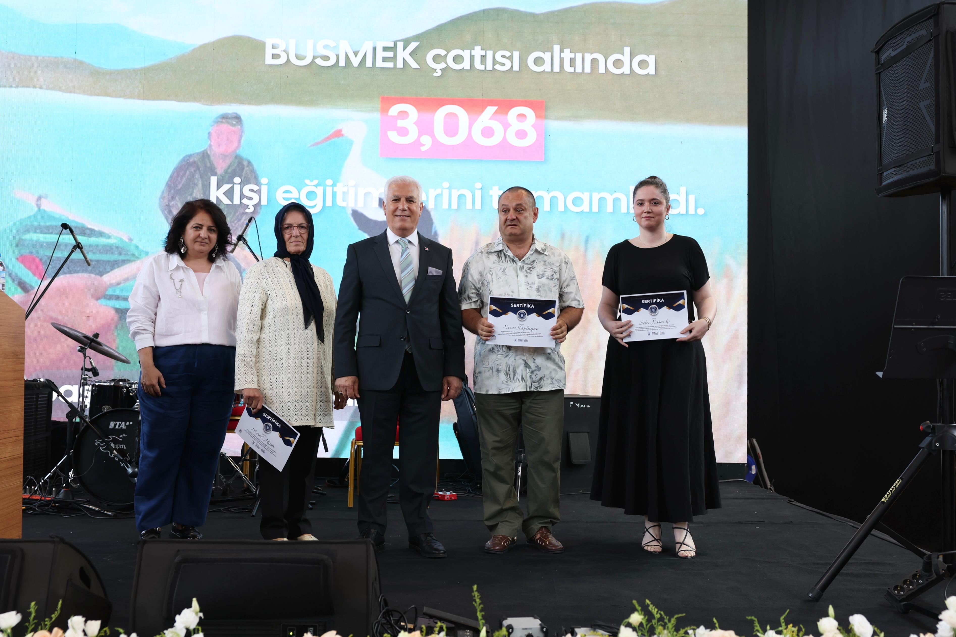 Bursa Büyükşehir Belediyesi’nin en önemli sosyal sorumluluk projelerinden biri olan BUSMEK tarafından düzenlenen ‘BUSMEK Yıl Sonu Sergisi’nin açılışı Atatürk Kültür Merkezi Merinos Yerleşkesi Fuar Alanı’nda gerçekleştirildi. 2024-2025 eğitim öğretim döneminde 16 farklı kurs merkezinde 30 eğitmenin katkısıyla düzenlenen eğitimlere katılan 3 bin 68 kursiyerin ortaya koyduğu yaklaşık bin 200 eser, sergide Bursalıların beğenisine sunuldu. Serginin açılışına Bursa Büyükşehir Belediye Başkanı Mustafa Bozbey ve eşi Seden Bozbey’in yanı sıra Büyükşehir Belediyesi Genel Sekreteri Doç. Dr. Ergül Halisçelik, Genel Sekreter Yardımcıları Ali Altunsoy, Mehmet Emin Direkçi, Mehmet Yıldız ve Mehmet Tözün Bingöl, Büyükşehir Belediyesi, ilçe belediyeleri ve siyasi partilerin yöneticileri, eğitmenler, kursiyerler ve çok sayıda vatandaş katıldı.